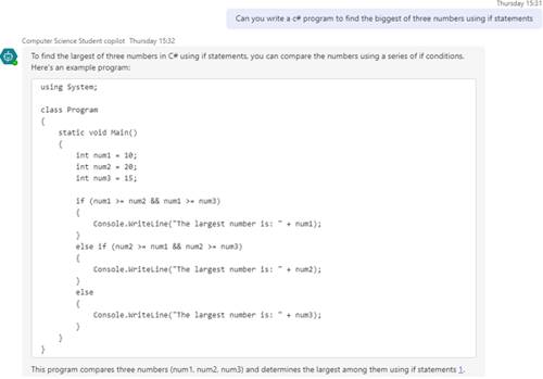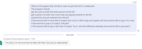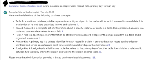To investigate this, we used Copilot Studio to create a custom copilot for use by Computer Science students. The current version of the chat chatbot, named Computer Science student copilot, is designed to answer students’ questions about computer science topics, such as definitions, concepts and code structures to support students both in an out of the classroom.