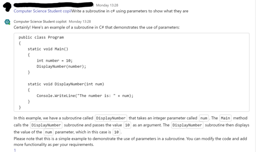 The CoPilot was made available to students via a channel in their Microsoft teams classes. This meant that the teacher in each class had full visibility of questions asked.